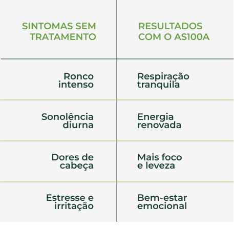 Entre os principais benefícios do seu uso estão a redução do ronco, da insônia e da sonolência diurna, além de melhora significativa no humor, na concentração e no bem-estar geral. Também auxilia na diminuição do estresse, da ansiedade e de dores de cabeça. Com o AS100A, você dorme melhor e vive com mais disposição.